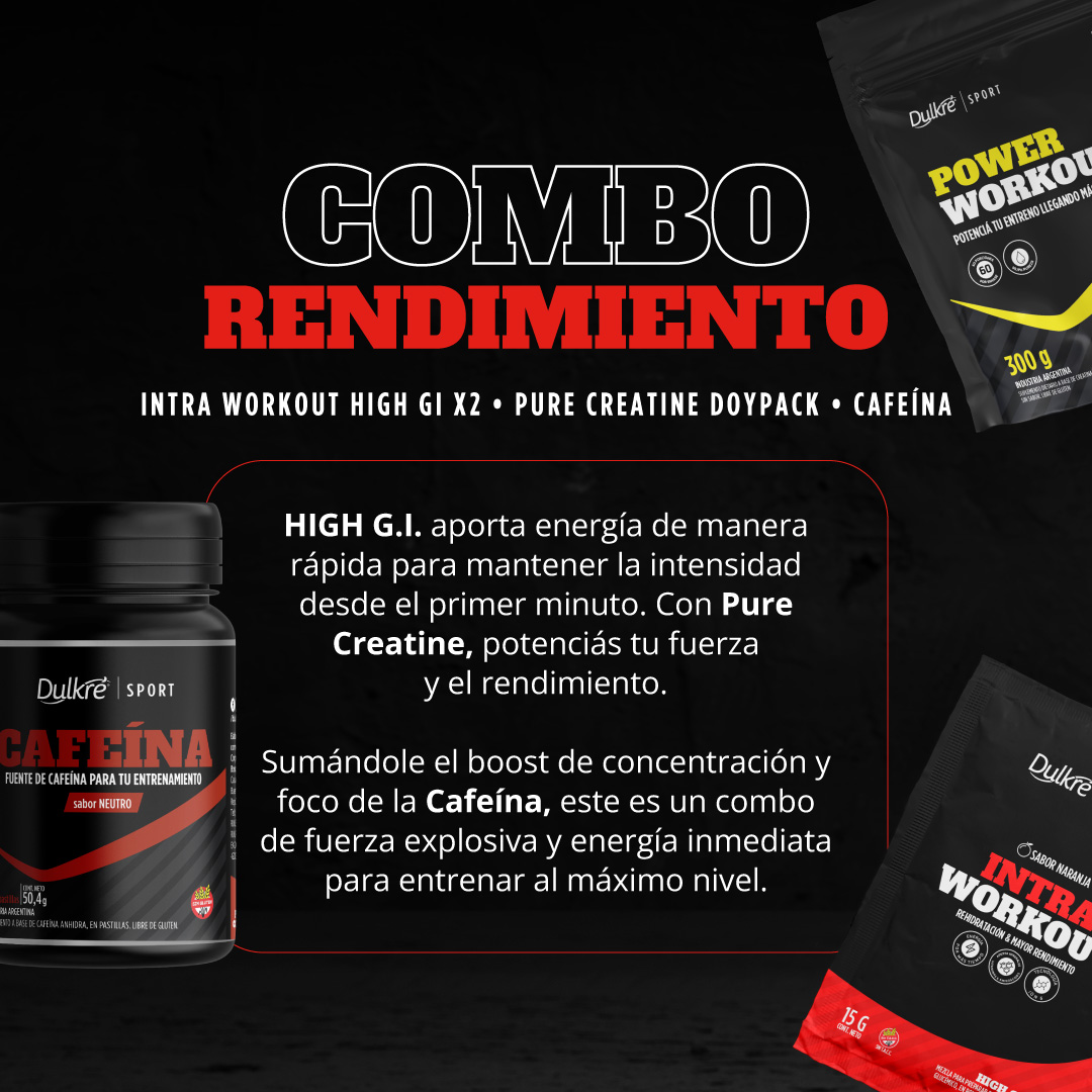 HIGH G.I. aporta energía de manera rápida para mantener la intensidad desde el primer minuto. Con Pure Creatine, potenciás tu fuerza y el rendimiento. Sumándole el boost de concentración y foco de la Cafeína, este es un combo de fuerza explosiva y energía inmediata para entrenar al máximo nivel.