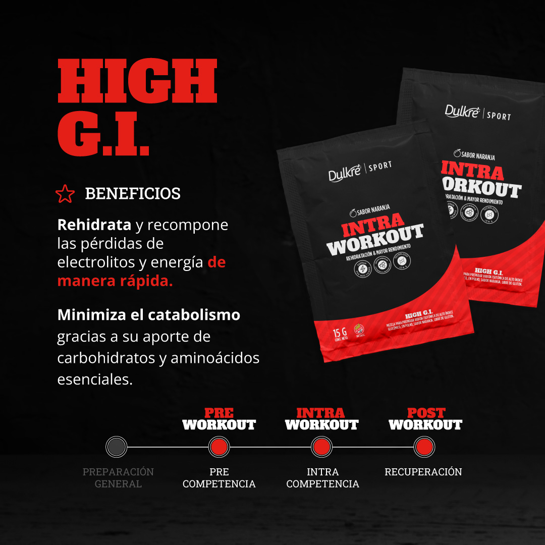 High G.I. Recompone pérdidas generadas por el ejercicio físico. Aporte de energía de rápida disponibilidad. Bebida con nivel osmótico controlado. Pure Creatine Doypack: Aumenta los niveles basales de las reservas de fosfocreatina. Contribuye a mejorar el rendimiento deportivo. Puede mejorar la ganancia de fuerza y de masa muscular. Cafeína: Aumento de la estimulación del sistema nervioso central, reduciendo la sensación de fatiga. Aumento de la capacidad de concentración. Mejora de la performance física y mental. Reducción de la percepción de esfuerzo y del dolor durante el entrenamiento.