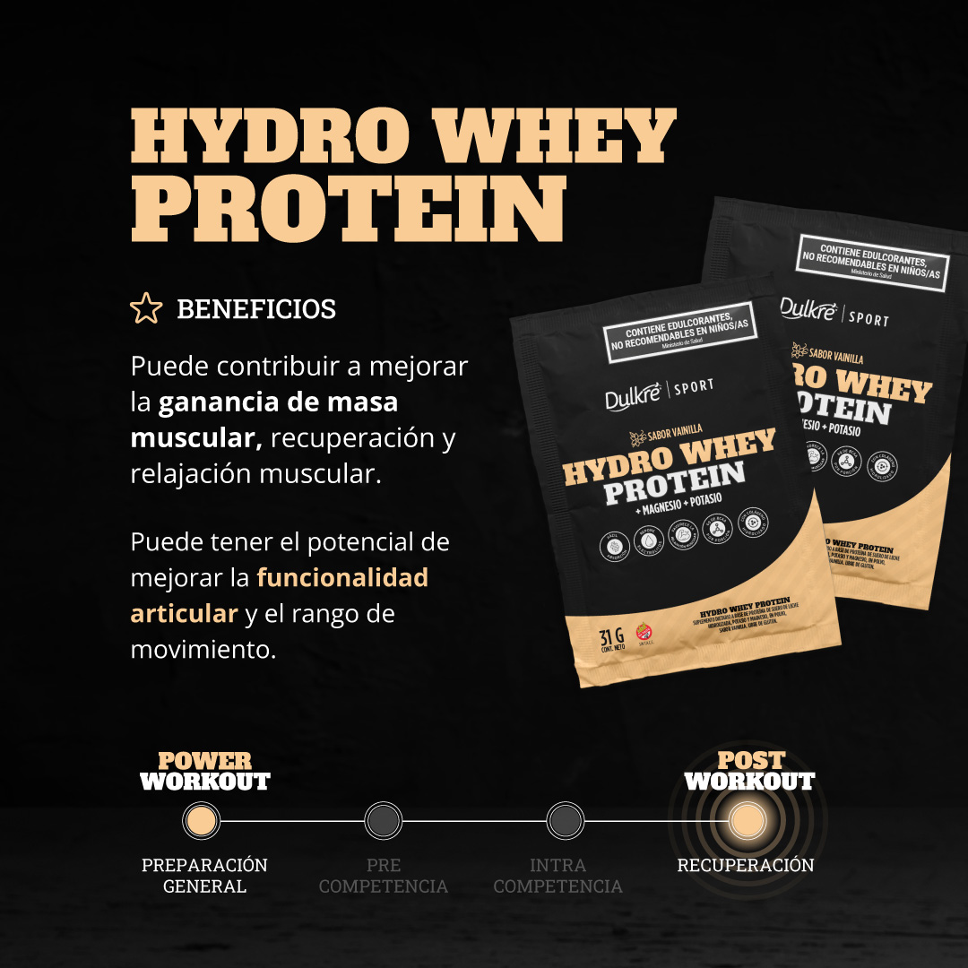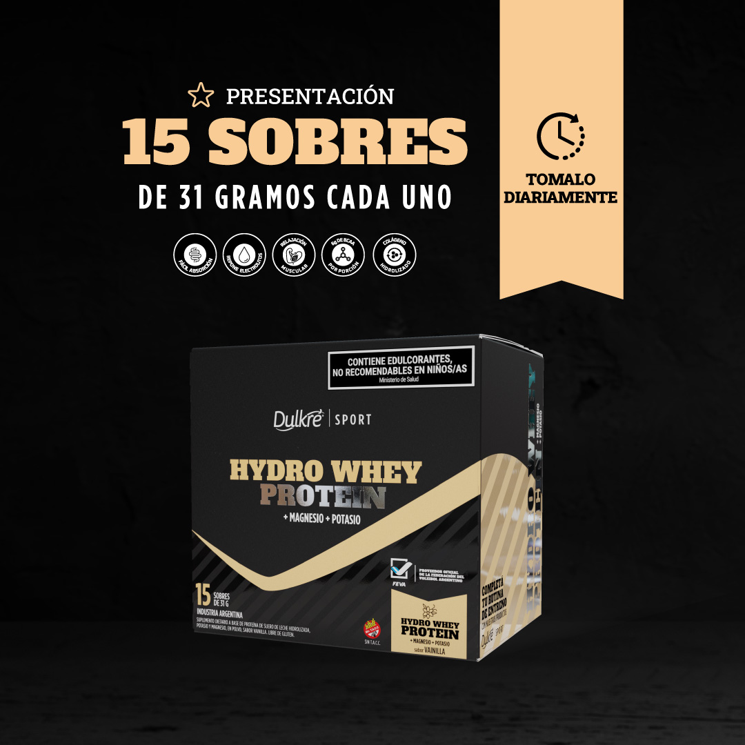 Nuestra Hydro Whey Protein combina proteína hidrolizada, colágeno doble hidrolizado, magnesio y potasio. Con un delicioso sabor vainilla, es la opción ideal para iniciarse en el mundo Dulkré Sport.