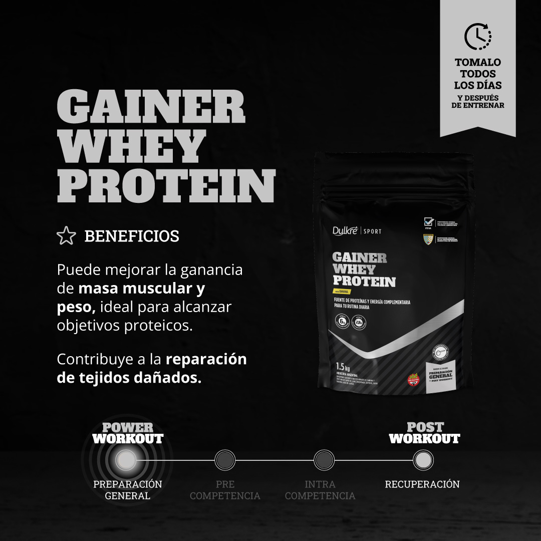 Gainer Whey Protein Puede contribuir a mejorar la ganancia de masa muscular y peso en deportistas que tengan altas demandas energéticas. Contribuye a la recuperación del glucógeno muscular y la reparación de tejidos dañados por el estímulo deportivo gracias a su aporte conjunto de hidratos de carbono y proteínas de alto valor biológico. Pure Creatine Aumenta los niveles basales de las reservas de fosfocreatina. Contribuye a mejorar el rendimiento deportivo. Puede mejorar la ganancia de fuerza y de masa muscular.