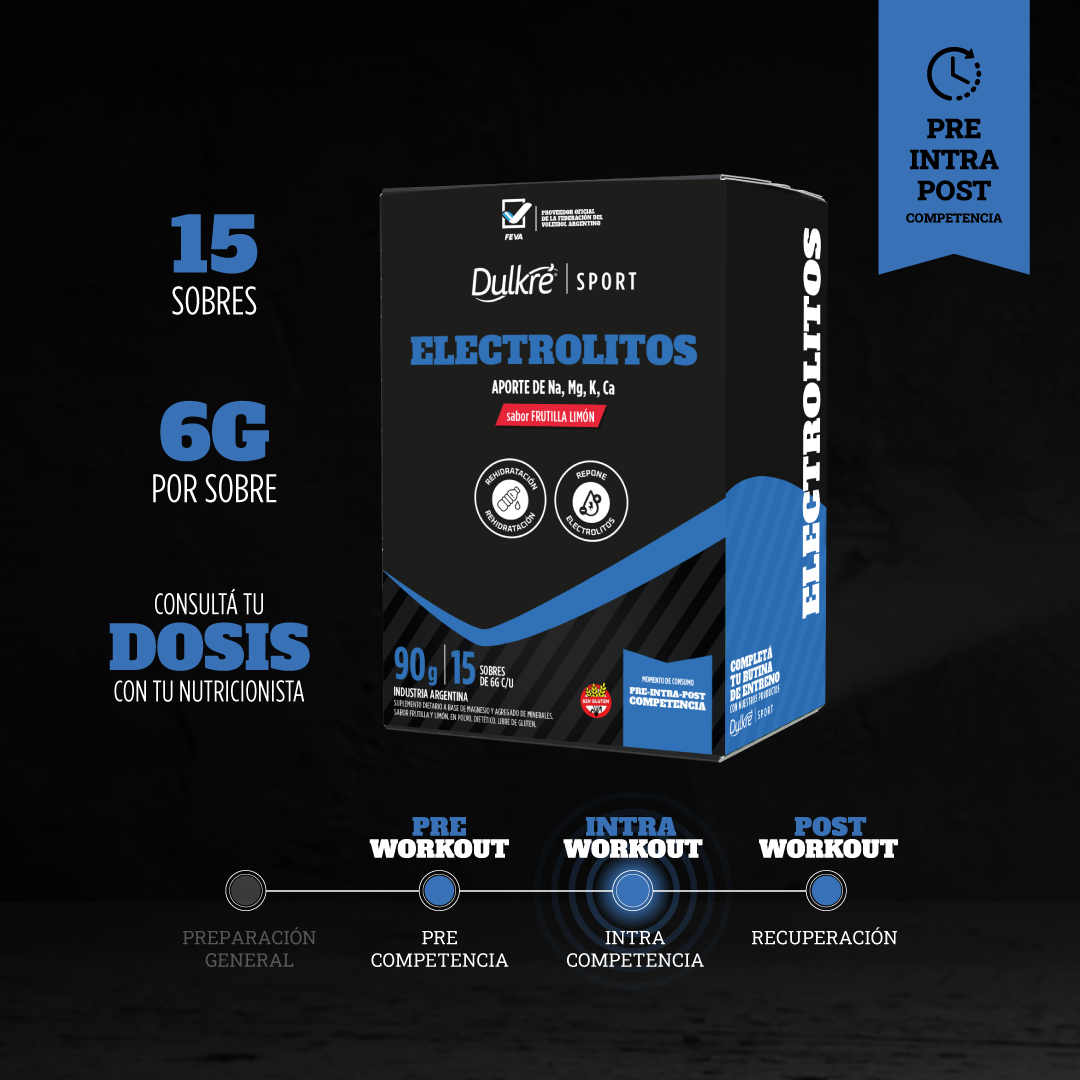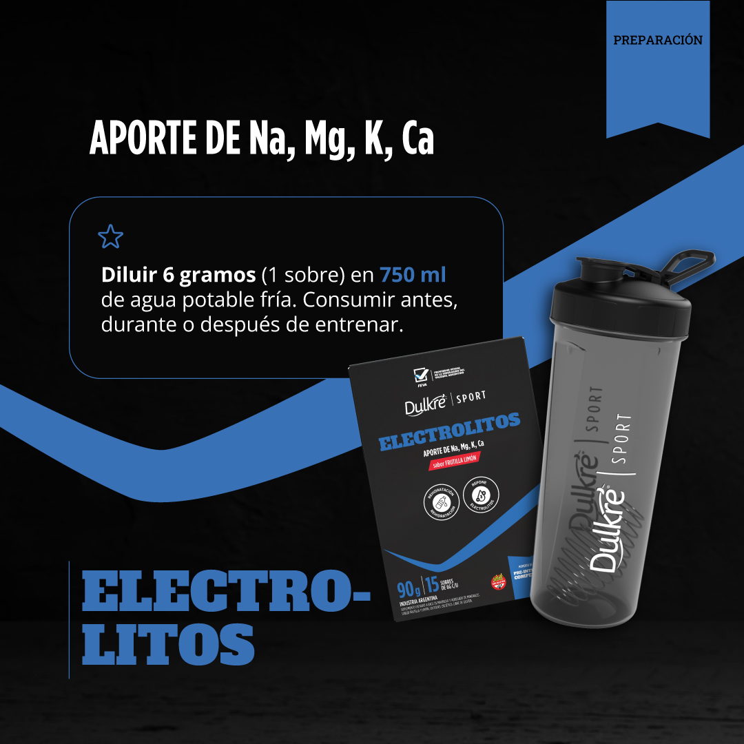 Electrolitos de Dulkré Sport es suplemento dietario en polvo, sabor frutilla y limón, ideado para preparar bebidas de rehidratación sin azúcares, que puedan aportar un conjunto de minerales relevantes durante la realización de actividad física como el sodio, potasio, magnesio y calcio.