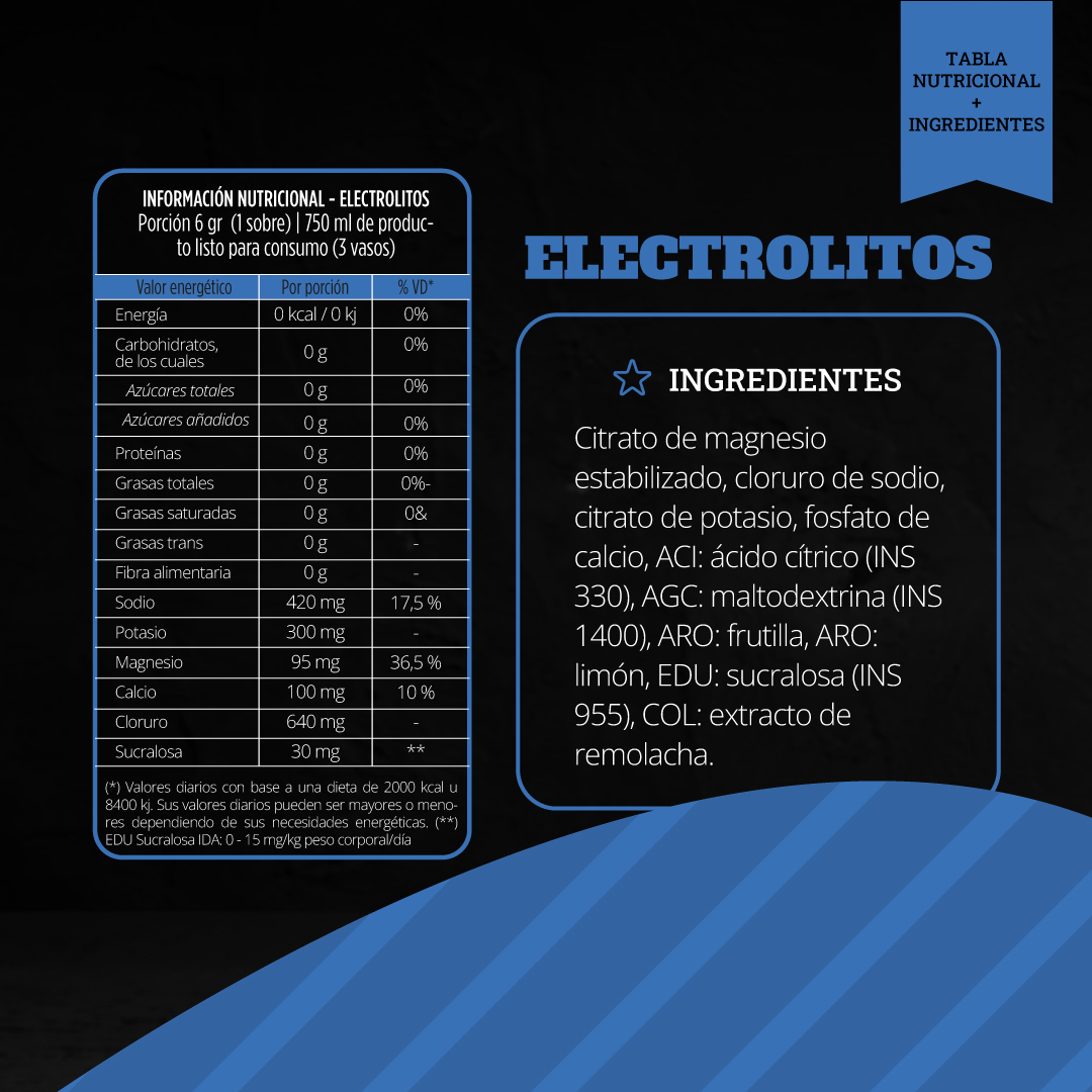 Citrato de magnesio estabilizado, cloruro de sodio, citrato de potasio, fosfato de calcio, ACI: ácido cítrico (INS 330), AGC: maltodextrina (INS 1400), ARO: frutilla, ARO: limón, EDU: sucralosa (INS 955), COL: extracto de remolacha.